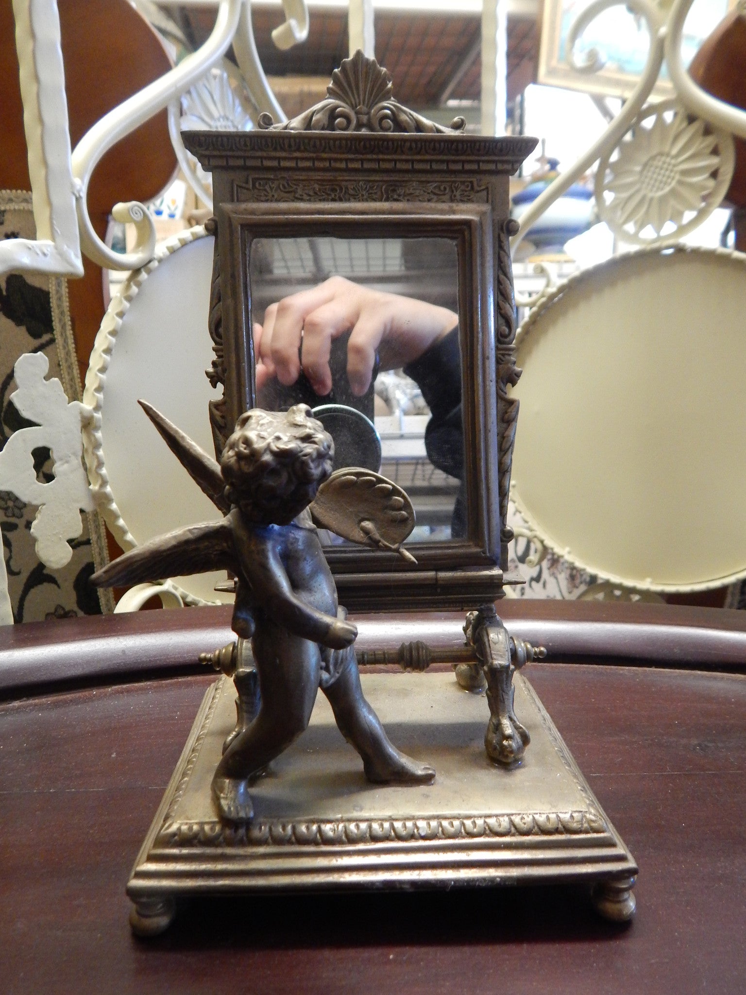 This is a very unique piece that would make a great eye-catcher or decoration on a vanity/dresser. This is a bronze cherub standing in front of a mirror who seems to be painting a self portrait. This item has fantastic quality on the casting and is a real full bronze casting.
