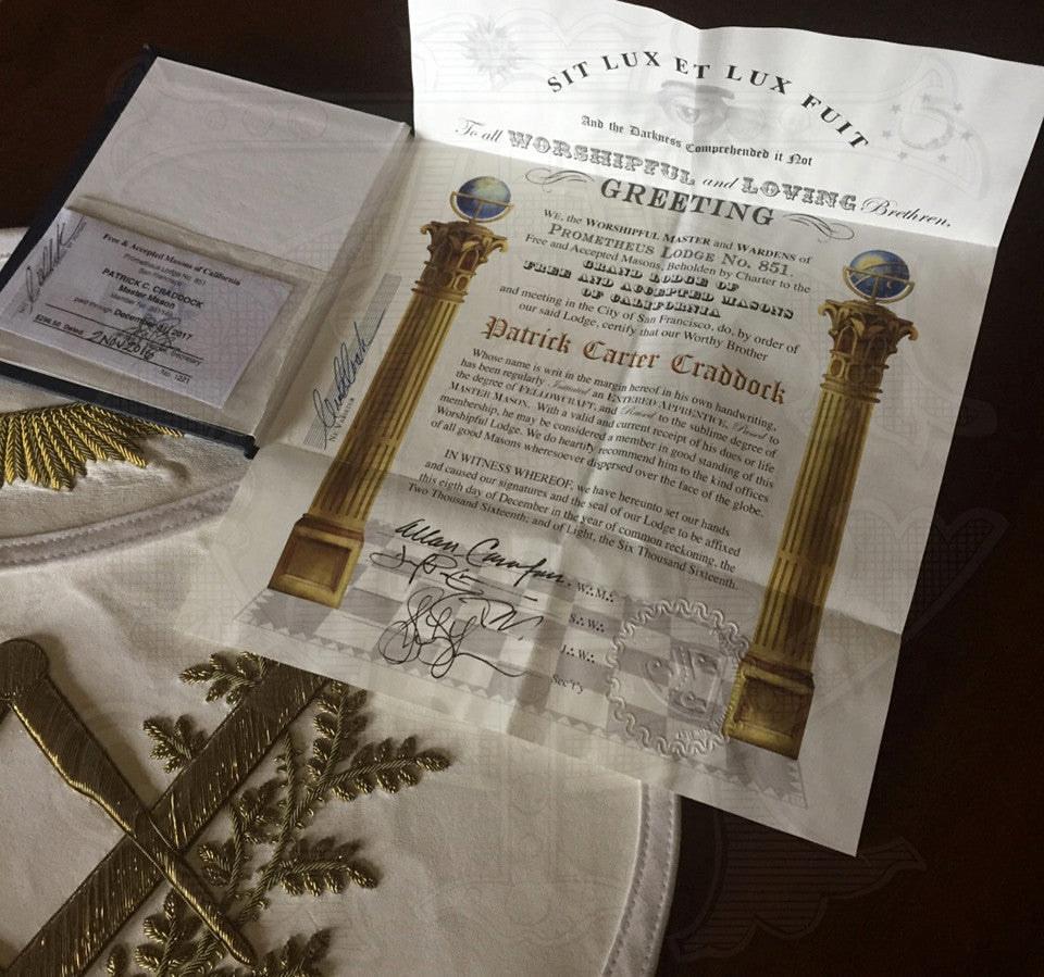 Designed for the traveling Brother, and used in conjunction with your current year's dues card, this patent is a piece of art that a Brother will?proud to?display?and reflects your pride as a member of our Ancient and Honorable Institution. ?We can also ship this patent to you unfolded, to display on your wall as an attractive reminder of your membership in our Noble Craft! ?